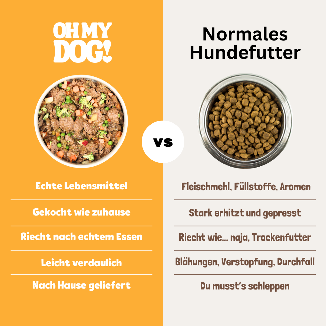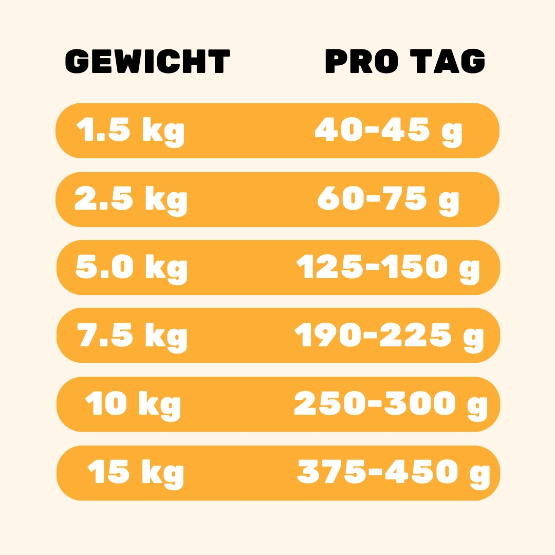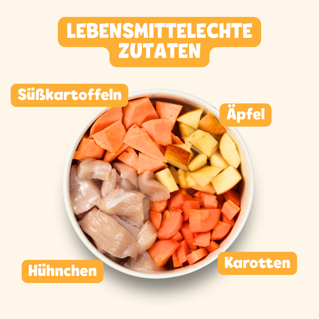 Hähnchenfleisch 60,00%, Hähnchenleber 10,00%, Süßkartoffel 5,00%, Zucchini 2,00%, Karotte 5,00%, Erbsen 2,50%, Kürbiskerne 2,00%, Spinat 3,00%, Apfel 3,00%, Blaubeeren 1,00%, Weizenkeimöl 1,50%, Algenöl 1,60%, Algenkalk 0,60%, Hagebuttenpulver 0,40%, Bierhefe 2,00%, Seealgenmehl 0,10%, Rosmarin 0,30%
