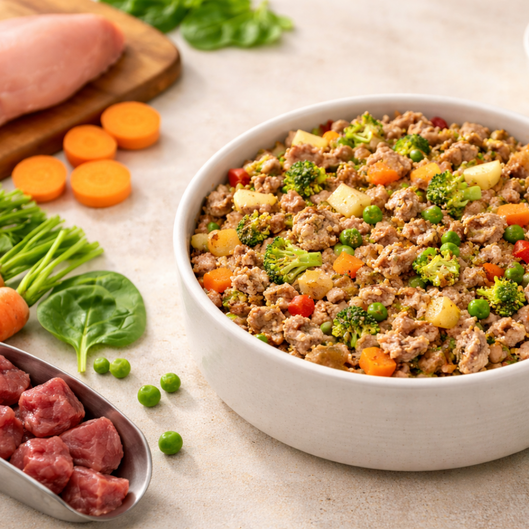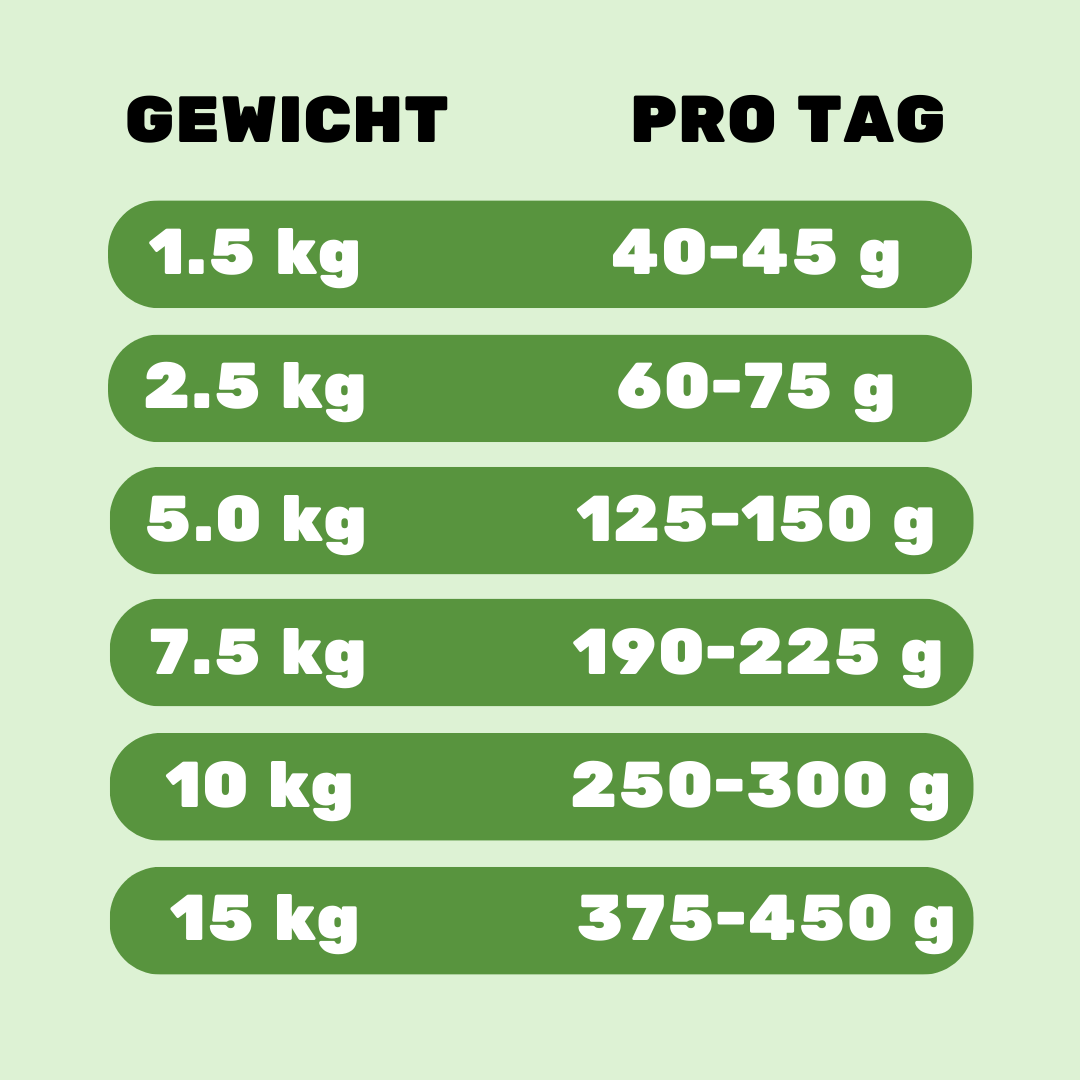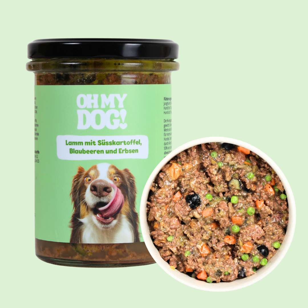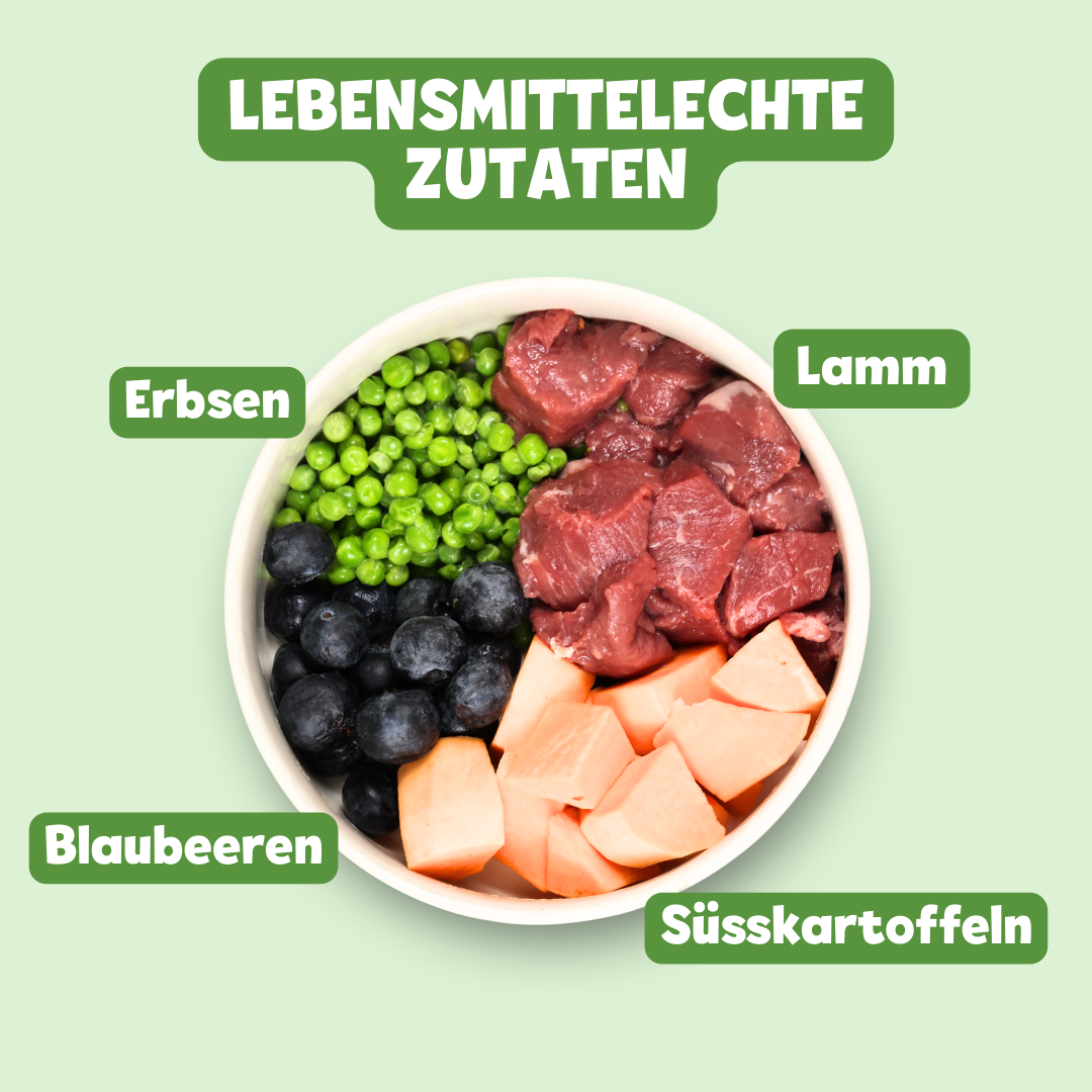 Lammfleisch 60,00%, Lamminnereien (Niere, Leber, Herz, Magen) 10,00%, Süßkartoffel 4,00%, Apfel 3,00%, Erbsen 3,00%, Karotten 3,00%, Brokkoli 3,00%, Zucchini 2,00%, Grünkohl 1,00%, Blaubeeren 2,00%, Kranbeeren 1,40%, Sonnenblumenkerne 1,00%, Kürbiskerne 1,00%, Hanfsamenöl 2,00%, Algenkalk 0,70%, Hagebuttenpulver 0,40%, Bierhefe 2,00%, Seealgenpulver 0,20%, Rosmarin 0,30%