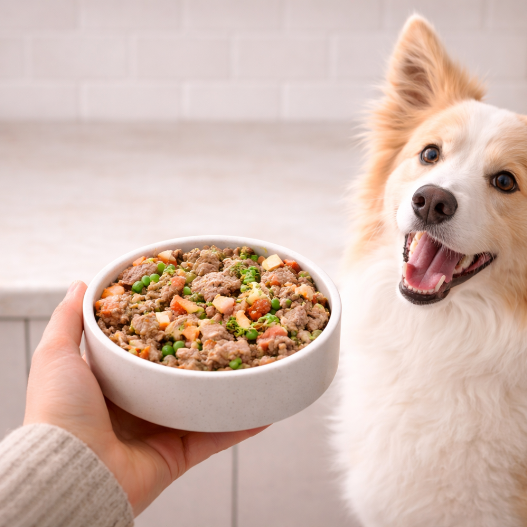 Rindermuskelfleisch 60,00%, Rinderinnereien (Herz, Niere, Pansen, Leber) 10,00%, Süßkartoffel 5,00%, Erbsen 4,00%, Karotten 4,00%, Brokkoli 3,00%, Zucchini 2,00%, Spinat 1,80%, Apfel 3,00%, Sonnenblumenkerne 1,00%, Kürbiskerne 1,00%, Algenöl 1,50%, Algenkalk 0,70%, Hagebuttenpulver 0,40%, Bierhefe 2,00%, Seealgenpulver 0,30%, Rosmarin 0,30%